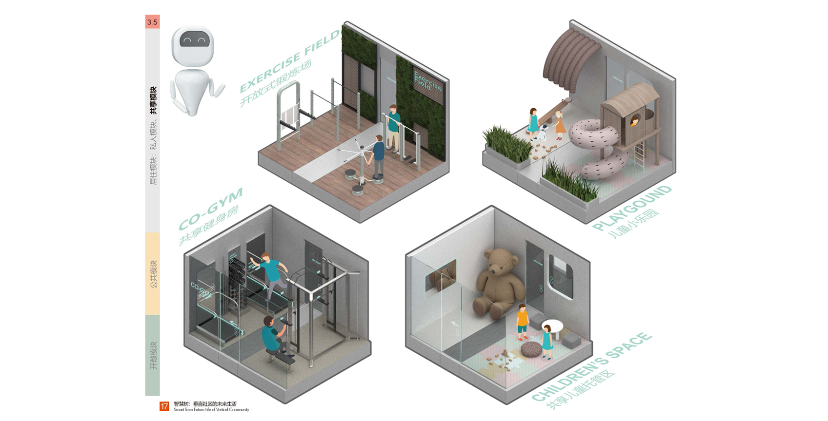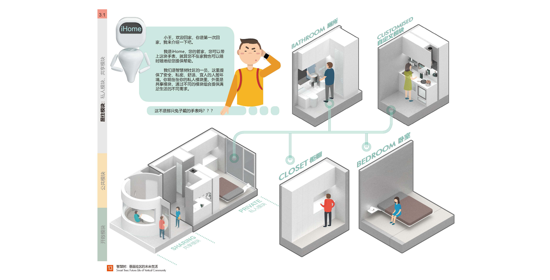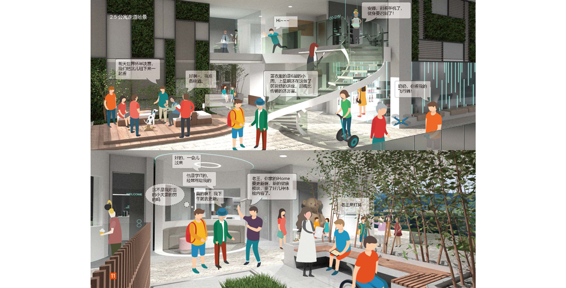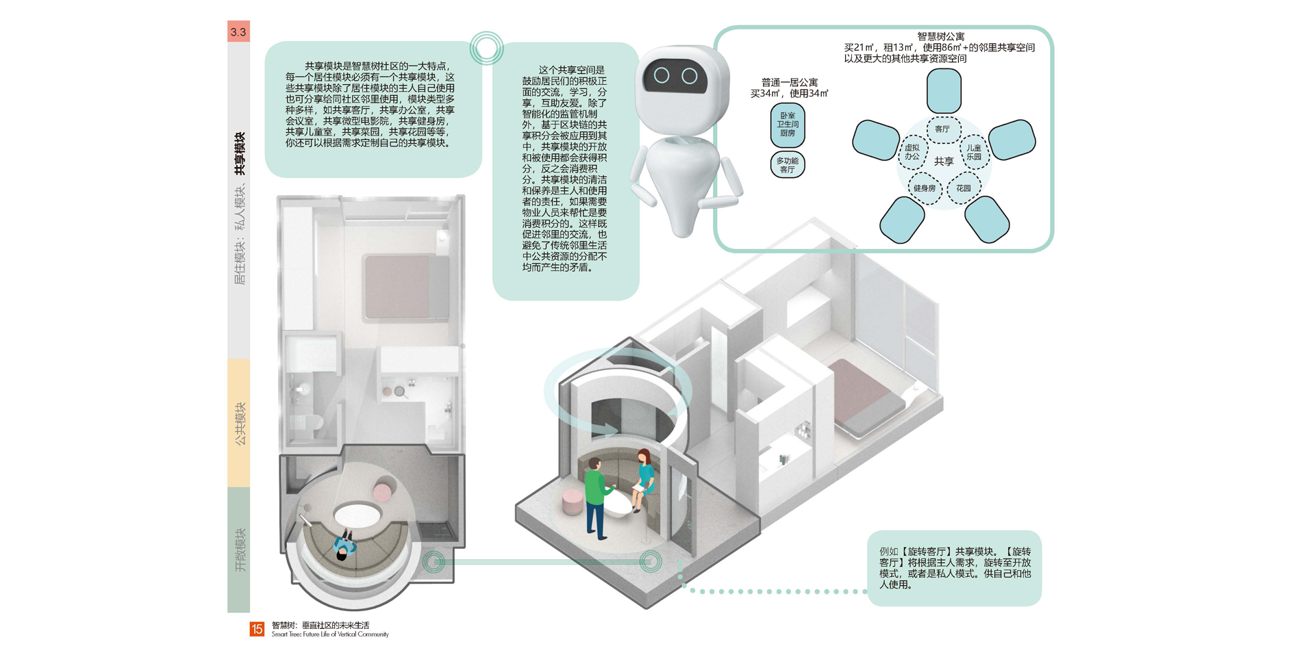 ? ? ?我們新的公寓把生活場景分成了三個部分:居住模塊,共享模塊,公共模塊。居住模塊是小而精的組合:安全私密,舒適宜人,組合靈活。共享模塊是智慧樹社區(qū)的一大特點:每一個居住模塊都有一個共享模塊,這些共享模塊除了居住模塊的主人自己使用,更重要的是可以分享給同社區(qū)鄰里使用,促進鄰里之間的互助互動和各種交流。模塊類型多種多樣,如共享客廳,共享辦公室,共享會議室,共享微型電影院,共享健身房,共享兒童室,共享菜園子等等,還可以根據(jù)自己的需求定制和打造自己的共享模塊。公共模塊是社區(qū)的公共資源,為社區(qū)提供便利服務的房間,如小超市,理發(fā)店,書吧,餐廳,咖啡廳,創(chuàng)客空間,快遞收發(fā)站等等。與其他模塊不同,公共模塊是會有專人經(jīng)營管理,這些模塊根據(jù)市場需求可以替換成不同功能。鄰居也會在其中有所互動,例如在“共享花園”種植的蔬菜,可以放在“微型超商”販賣,或者有技能的租戶也可以在此兼職等等。