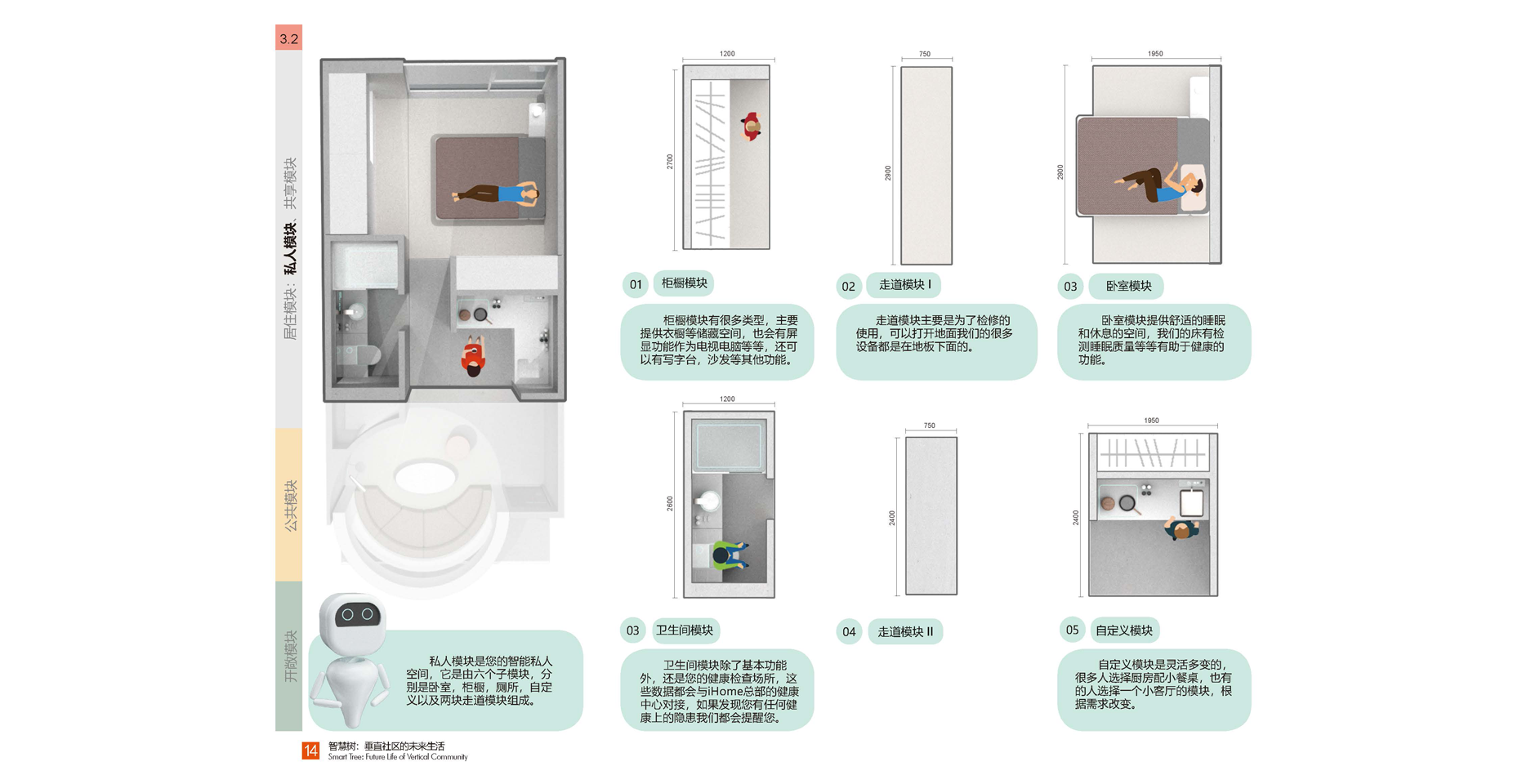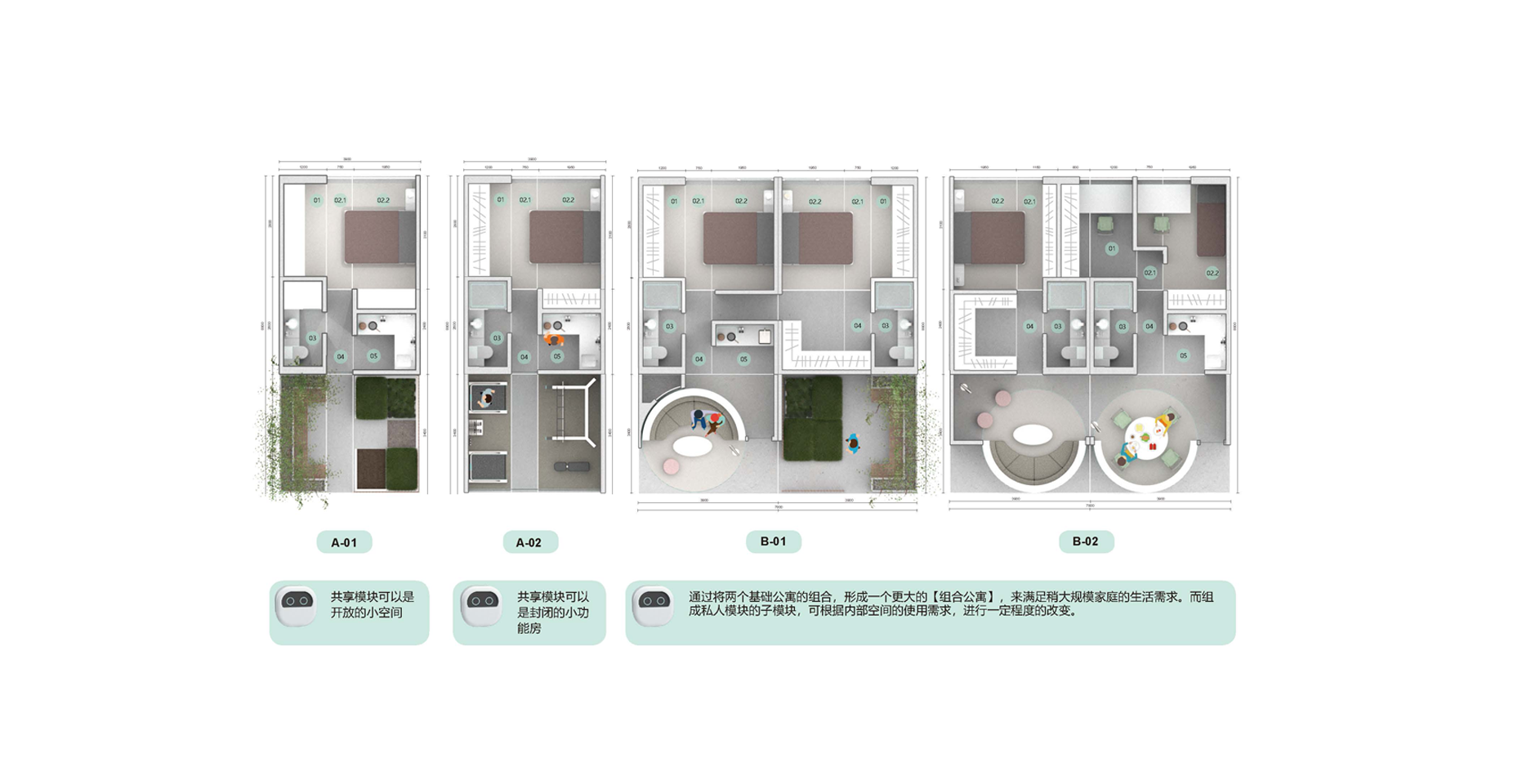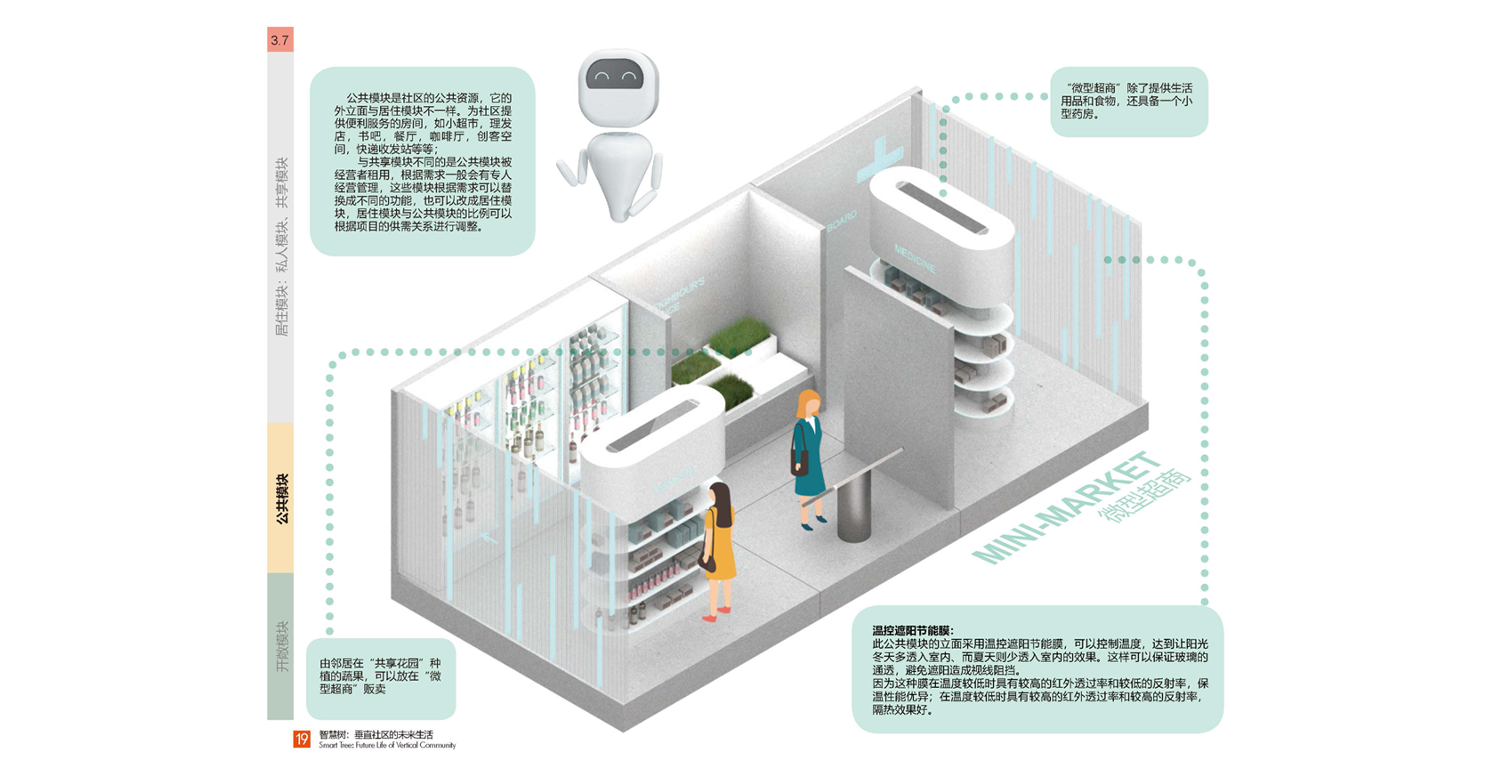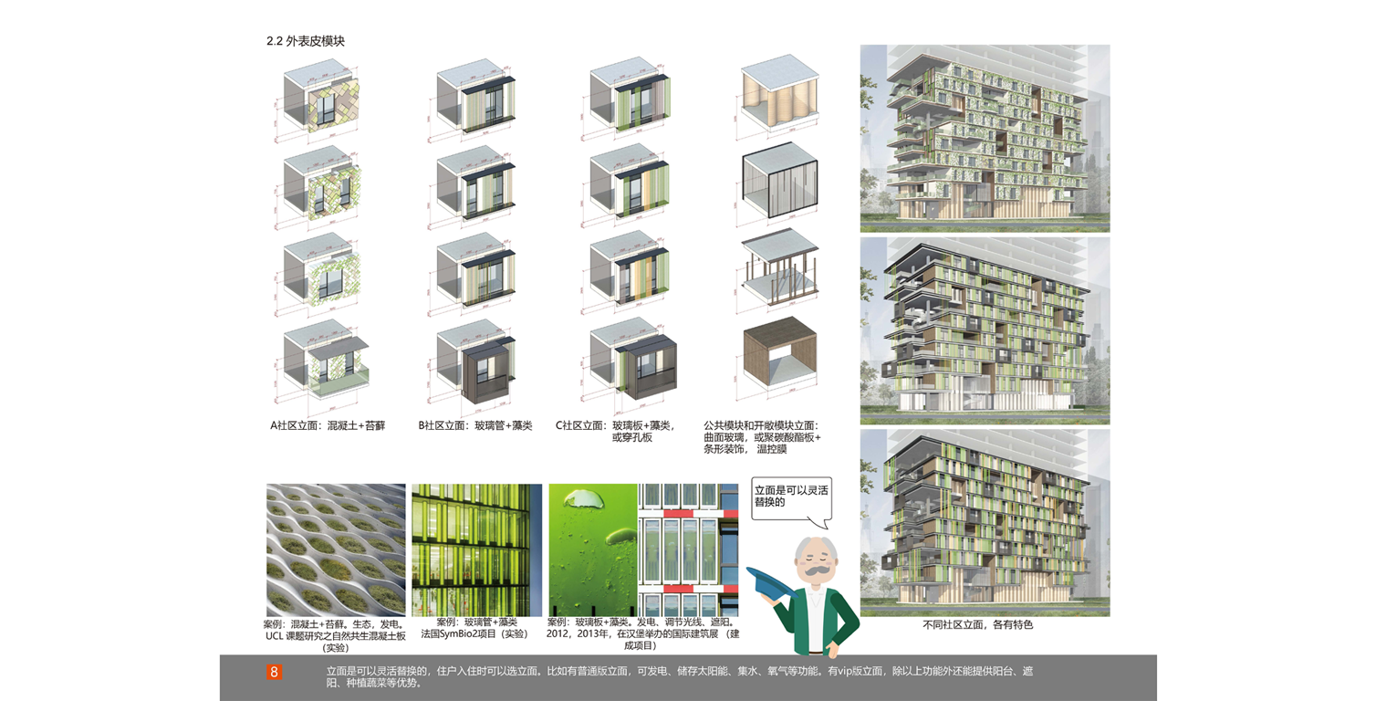 ? ? ?我們新的公寓把生活場景分成了三個部分:居住模塊,共享模塊,公共模塊。居住模塊是小而精的組合:安全私密,舒適宜人,組合靈活。共享模塊是智慧樹社區(qū)的一大特點:每一個居住模塊都有一個共享模塊,這些共享模塊除了居住模塊的主人自己使用,更重要的是可以分享給同社區(qū)鄰里使用,促進鄰里之間的互助互動和各種交流。模塊類型多種多樣,如共享客廳,共享辦公室,共享會議室,共享微型電影院,共享健身房,共享兒童室,共享菜園子等等,還可以根據(jù)自己的需求定制和打造自己的共享模塊。公共模塊是社區(qū)的公共資源,為社區(qū)提供便利服務的房間,如小超市,理發(fā)店,書吧,餐廳,咖啡廳,創(chuàng)客空間,快遞收發(fā)站等等。與其他模塊不同,公共模塊是會有專人經(jīng)營管理,這些模塊根據(jù)市場需求可以替換成不同功能。鄰居也會在其中有所互動,例如在“共享花園”種植的蔬菜,可以放在“微型超商”販賣,或者有技能的租戶也可以在此兼職等等。