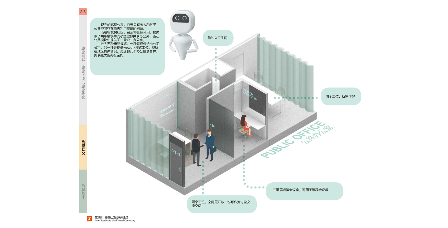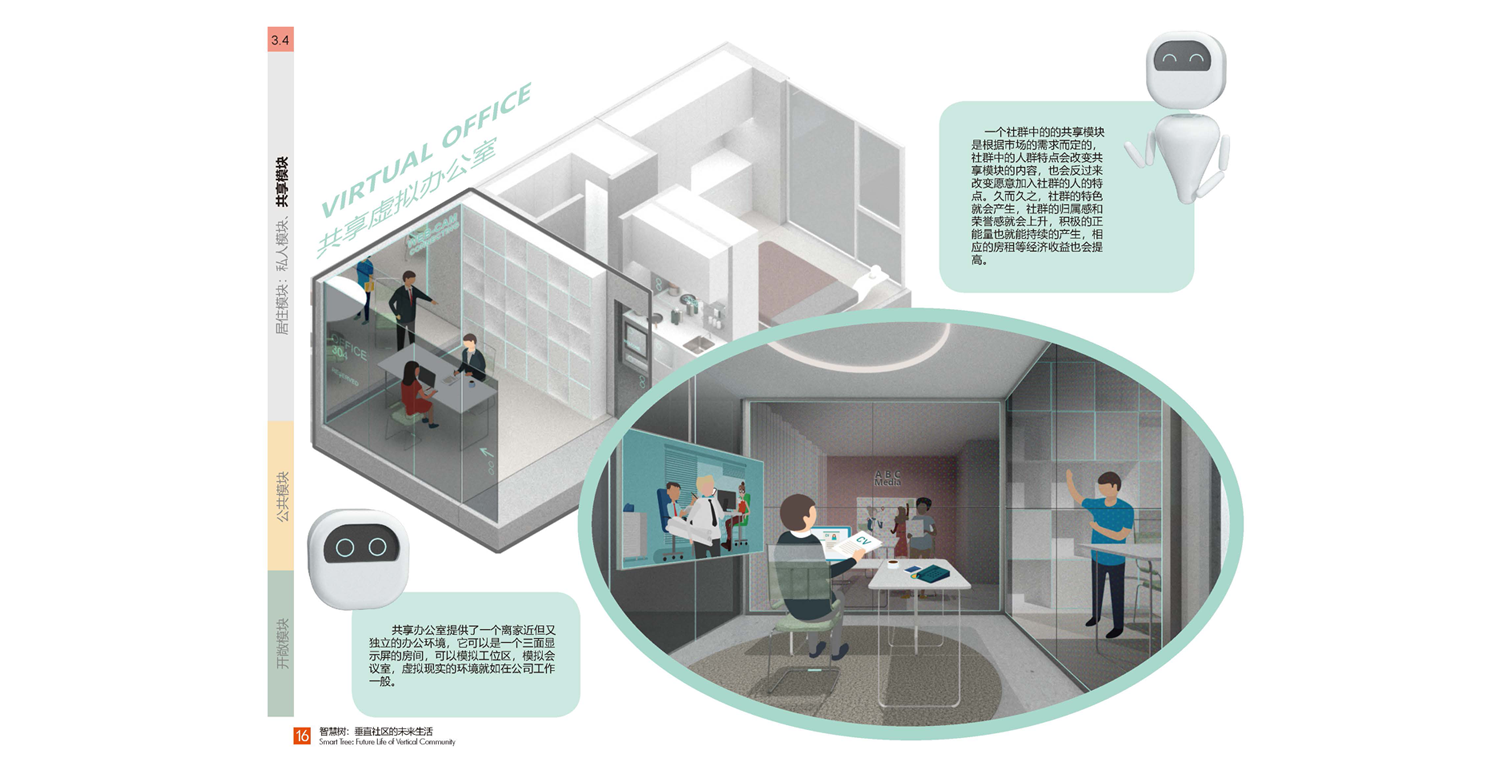 ? ? ?傳統(tǒng)的高層公寓,白天只有老人和孩子,居住空間存在白天利用率低的問題。而在智慧樹社區(qū),空間資源將合理利用。樓內(nèi)生活類的共享模塊可以開放使用,另外辦公類的空間可以吸引臨時辦公和會議的人員,可以與公共模塊中各種經(jīng)營者合作。提供多種出租模式,公共模塊可以給小公司長租;共享模塊可以提供靈活的增補。視所在地區(qū)的具體市場需求,幾個辦公模塊也可以自由合并,提供更大的辦公空間。