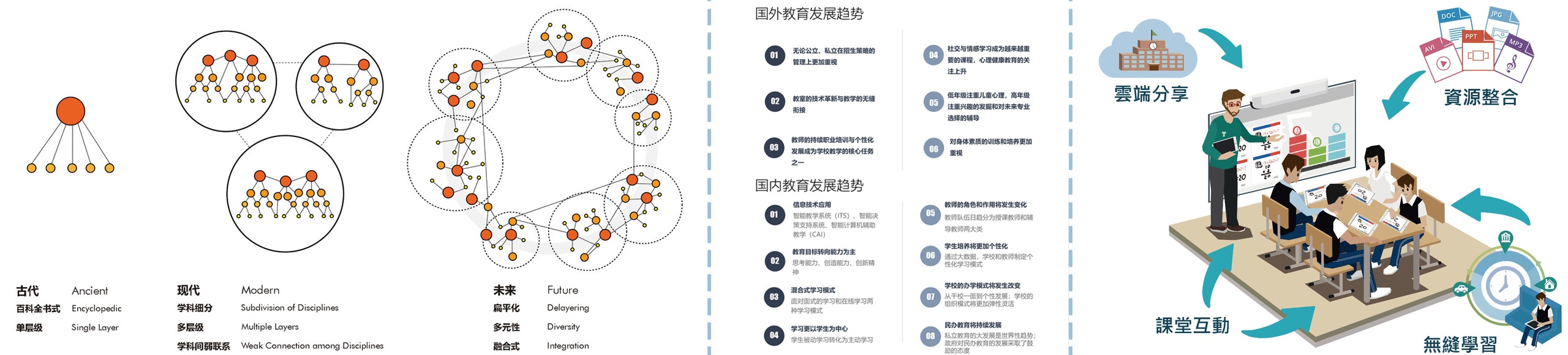 答:根據(jù)法國(guó)哲學(xué)家德勒茲關(guān)于社會(huì)及知識(shí)結(jié)構(gòu)發(fā)展理論來(lái)看,古代教學(xué)模式是根系式的:一個(gè)老師可以教授所有學(xué)科;到了現(xiàn)代社會(huì)是簇根式的:根據(jù)專業(yè)科目分配專業(yè)老師;未來(lái)教育則會(huì)是更扁平化、多元化、融合式的教學(xué)模式。教師與學(xué)生之間,專業(yè)之間,學(xué)科之間,年級(jí)之間的界限會(huì)更加模糊與關(guān)系更加扁平化;教學(xué)環(huán)境上,學(xué)習(xí)和生活空間,教室與其他公共空間等之間,私密與非私密空間之間的關(guān)系也變得越來(lái)越多元化。