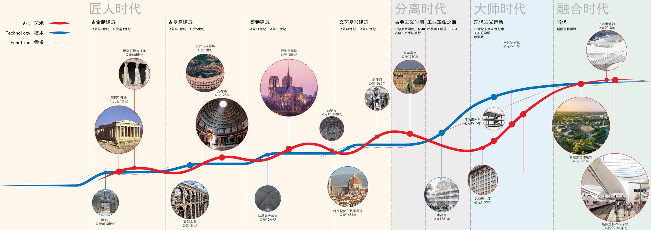 在文藝復(fù)興之前,我們稱這個時期為漫長的匠人時代,在這一時期建筑行業(yè)往復(fù)發(fā)展的過程中,匠人起到了決定性的作用。匠人作為集“工”與“藝”為一體的存在,保證了技術(shù)和藝術(shù)緊密聯(lián)系;但另一方面,受限于匠人自身的專業(yè)局限性,建筑行業(yè)的發(fā)展始終較為緩慢。因此匠人時代的行業(yè)發(fā)展特點是技術(shù)和藝術(shù)交替進步,緩慢向前。在匠人時代很長的一段時間里,建筑行業(yè)最頭疼最難以解決的問題依然是“如何把房子蓋起來”。