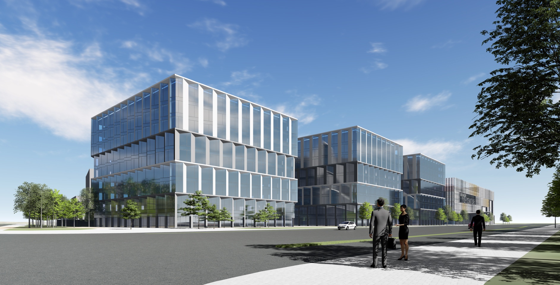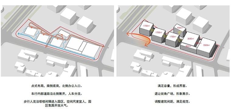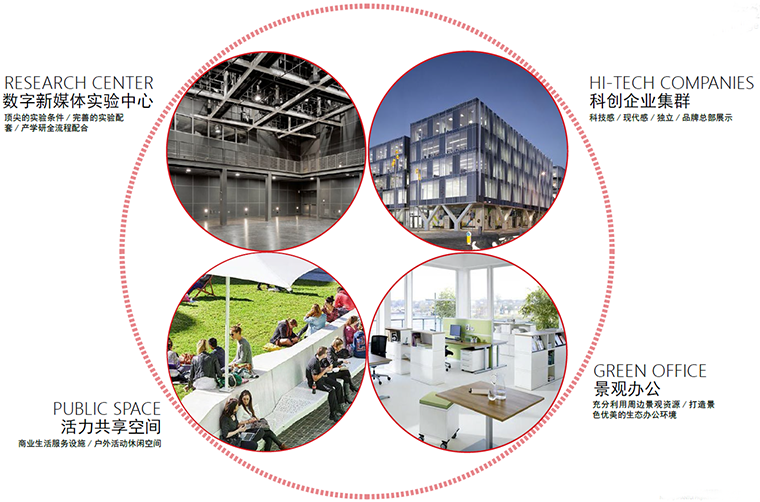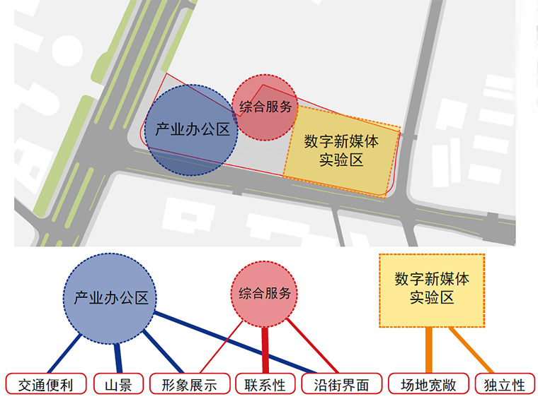 根據(jù)功能特性和需求,產(chǎn)業(yè)辦公區(qū)需要便利的交通和企業(yè)形象展示面,適合布置在西側(cè)緊鄰城市主干道一側(cè);