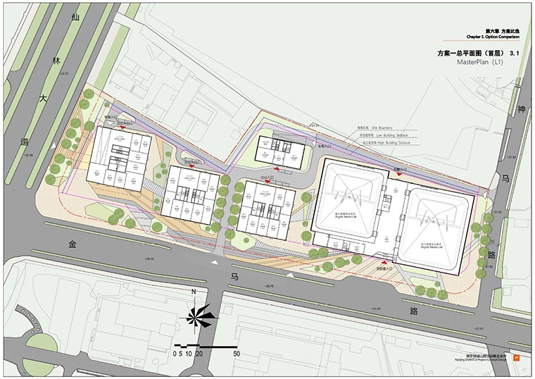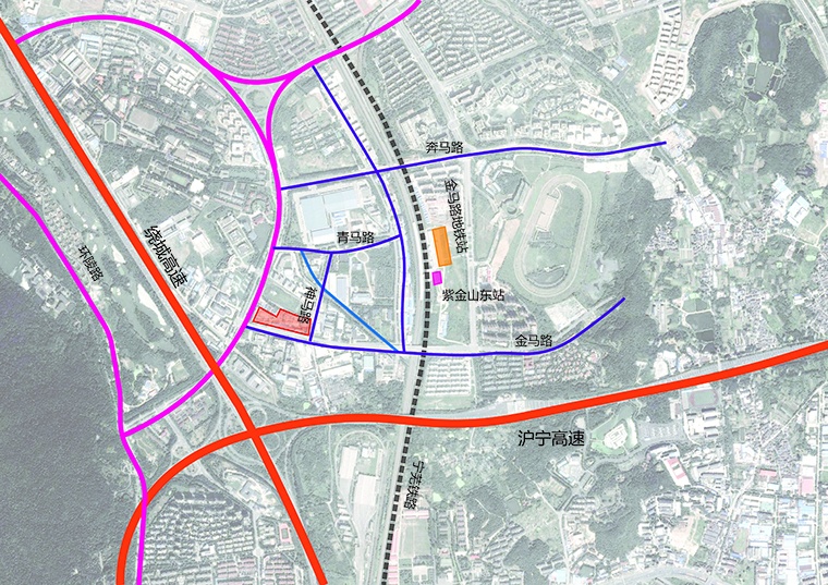 基地位于馬群科技園南部、多元中心區(qū)內(nèi);該區(qū)域緊鄰西側(cè)城市主干道仙林大道與繞城公路,南側(cè)有滬寧高速。基地周邊道路為園區(qū)內(nèi)部干道,南面直臨金馬路,東面可接入神馬路。