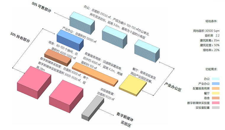 根據(jù)要求,場(chǎng)地主要將分為產(chǎn)業(yè)辦公區(qū)和數(shù)字新媒體實(shí)驗(yàn)區(qū)兩個(gè)相對(duì)獨(dú)立的區(qū)塊。