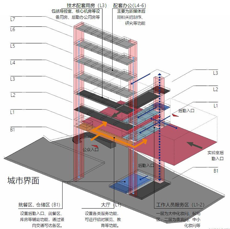 2.作人員功能區(qū):主要入口設(shè)置在地下,臨時(shí)入口設(shè)置在北側(cè),保護(hù)隱私,流線獨(dú)立。臨近實(shí)驗(yàn)室一層二層設(shè)置服務(wù)區(qū)和接待區(qū);