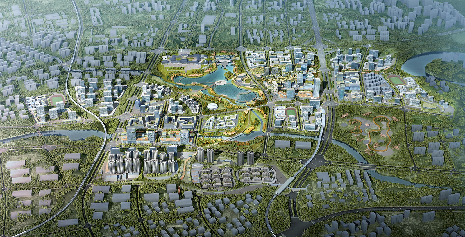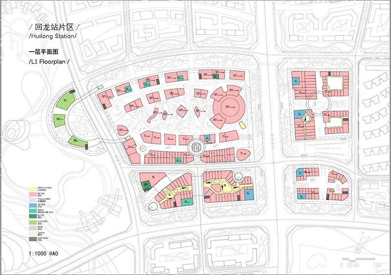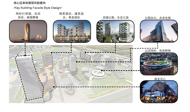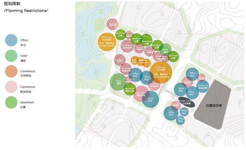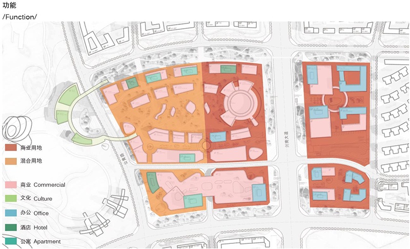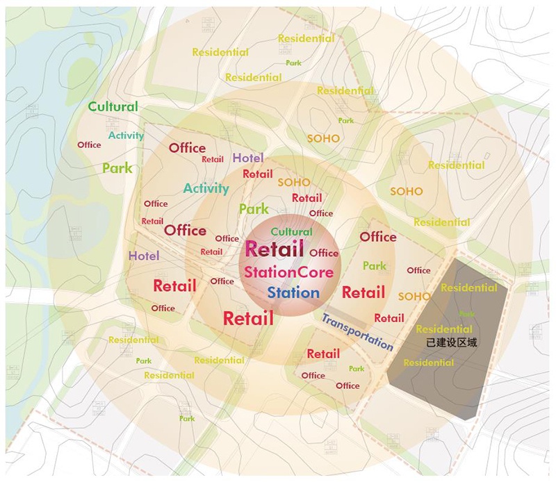 在規(guī)劃設(shè)計中,功能布局概念遵循一體化城市設(shè)計導(dǎo)則。由站城核心區(qū)向外圍影響區(qū)呈放射狀布置商業(yè),辦公,酒店,商住,文化設(shè)施,社區(qū)服務(wù),公共開放綠地,住宅等功能。