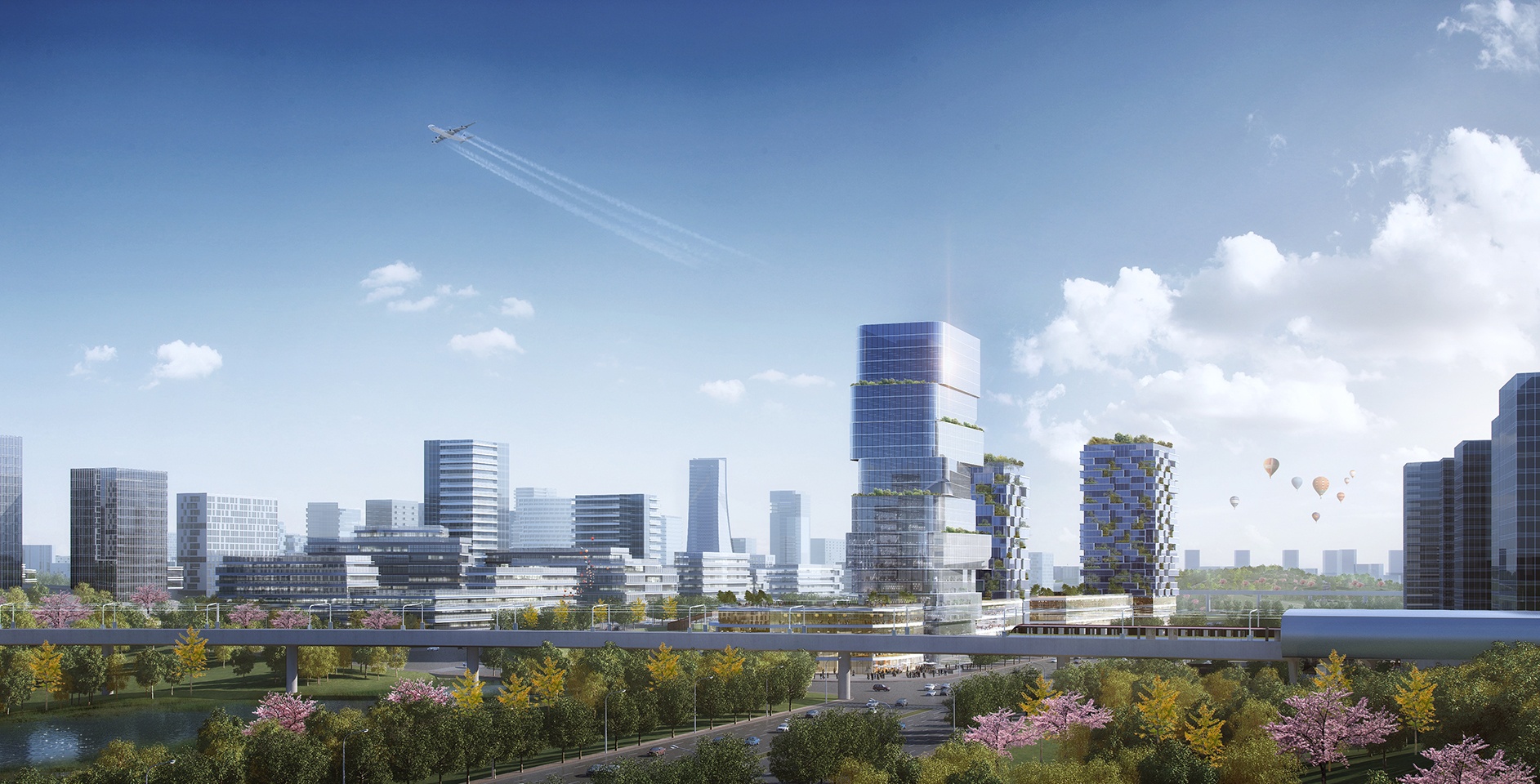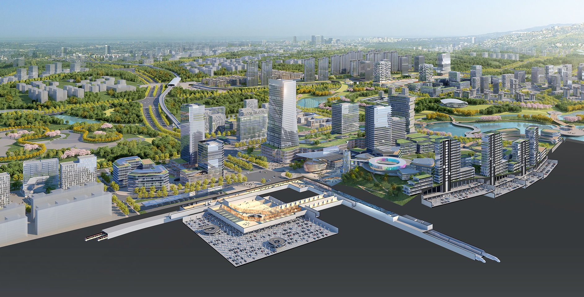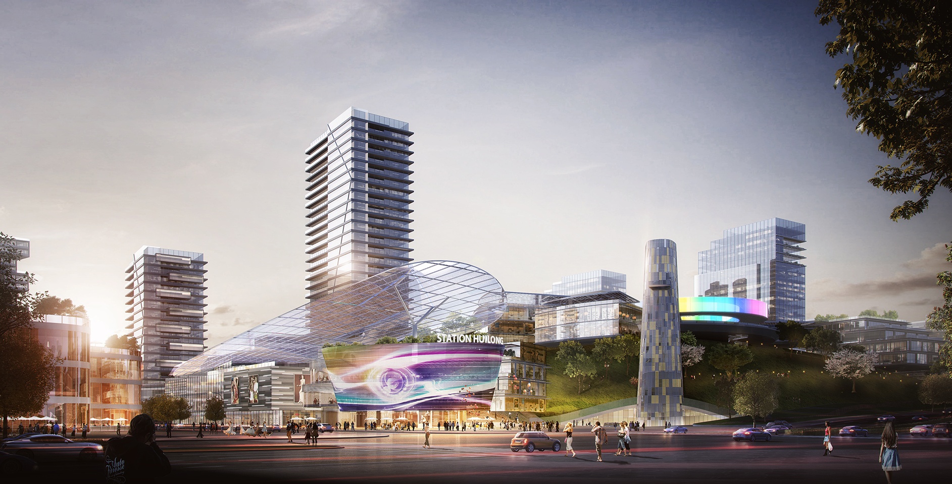 在規(guī)劃設(shè)計中,功能布局概念遵循一體化城市設(shè)計導(dǎo)則。由站城核心區(qū)向外圍影響區(qū)呈放射狀布置商業(yè),辦公,酒店,商住,文化設(shè)施,社區(qū)服務(wù),公共開放綠地,住宅等功能。