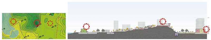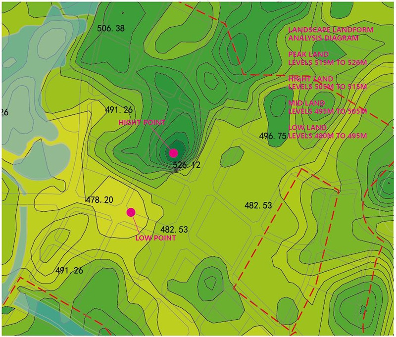 面對這樣的情況有兩種處理方式,一個是鏟平,將高區(qū)的土方填到低區(qū),使地面平整。另一種是利用40 多米的山峰,打造成設(shè)計亮點,化劣勢為特色。