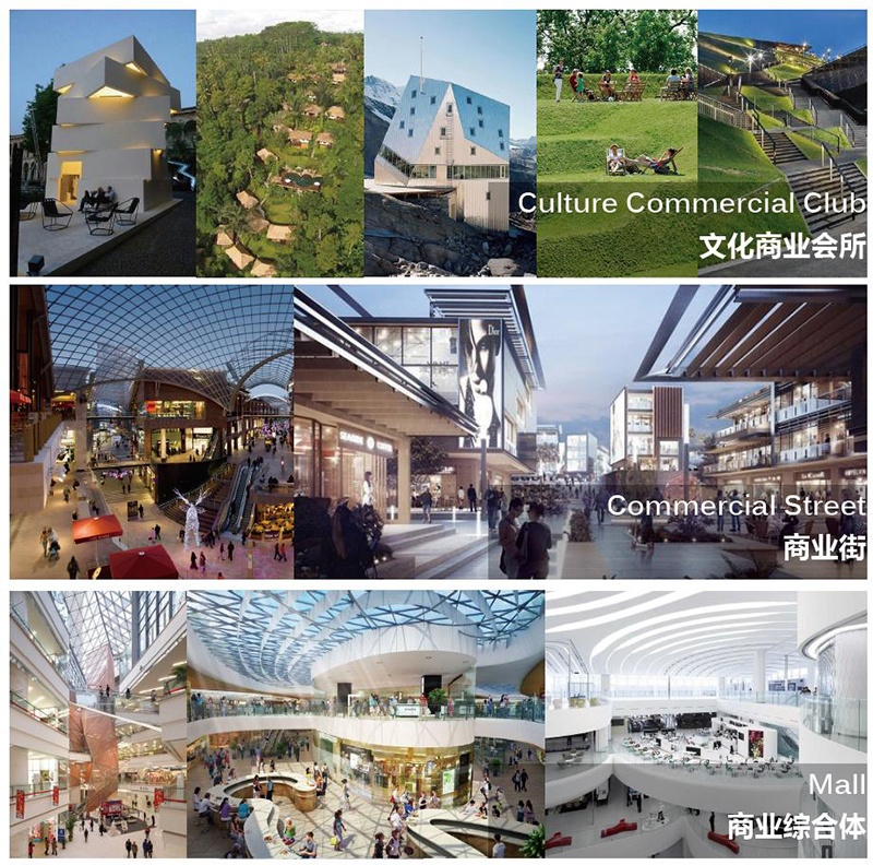 從北到南的層次:文化商業(yè)會所、商業(yè)街、mall。幾種層級的商業(yè)產(chǎn)品,滿足不同的生活需求。