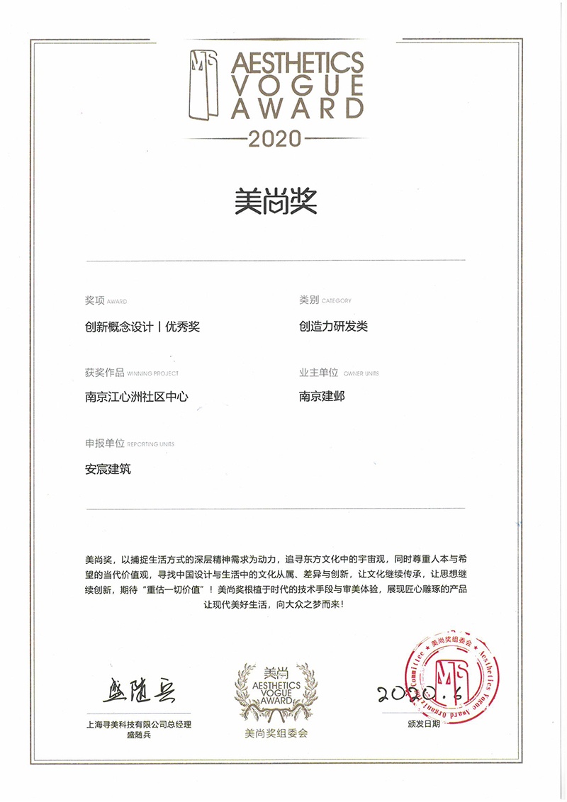 在剛剛過去的6月20日下午,2019-2020年度美尚獎頒獎典禮在上海安莎國際會議中心隆重舉行。ANT的南京江心洲社區(qū)中心項目獲得了創(chuàng)新概念設(shè)計優(yōu)秀獎的好成績!