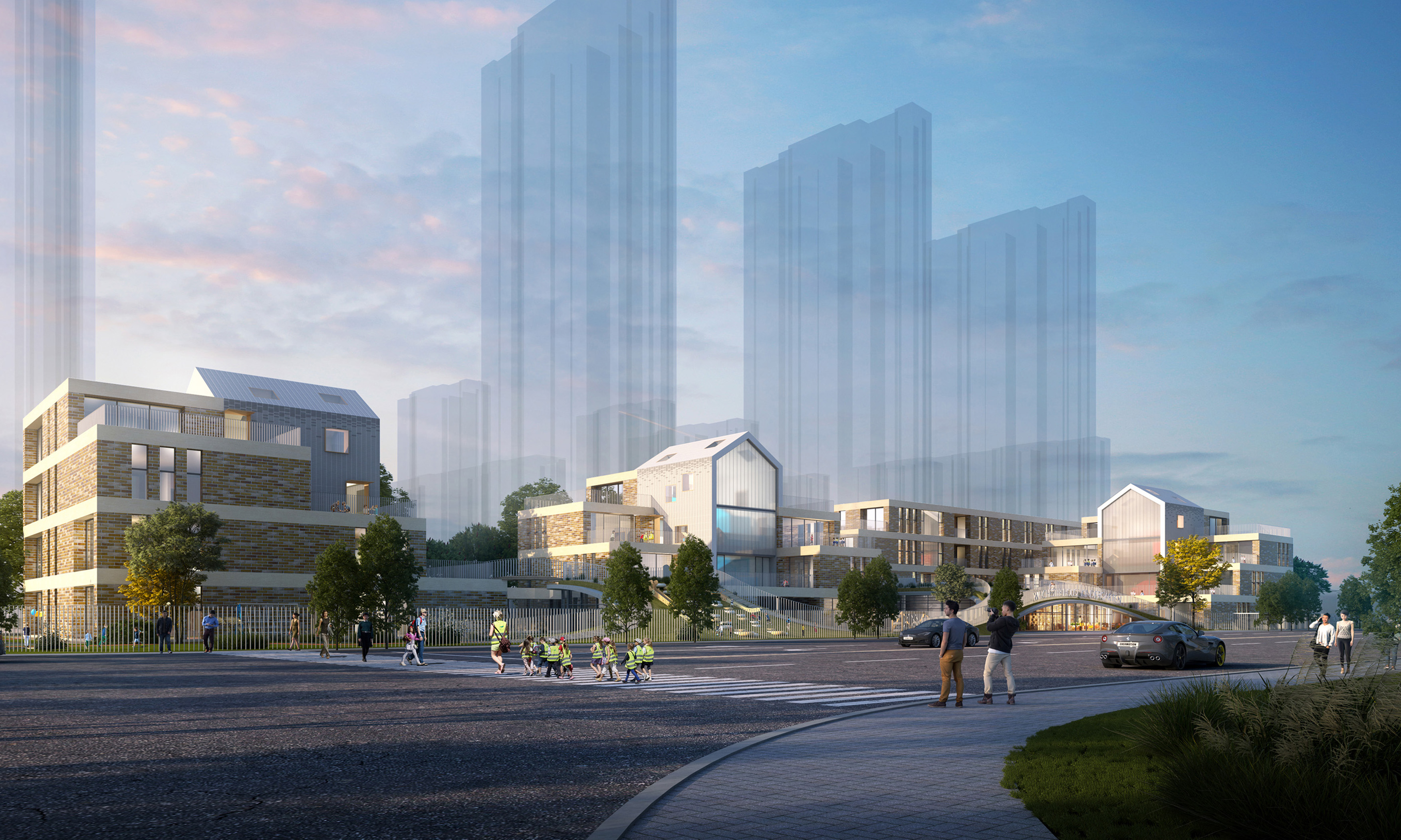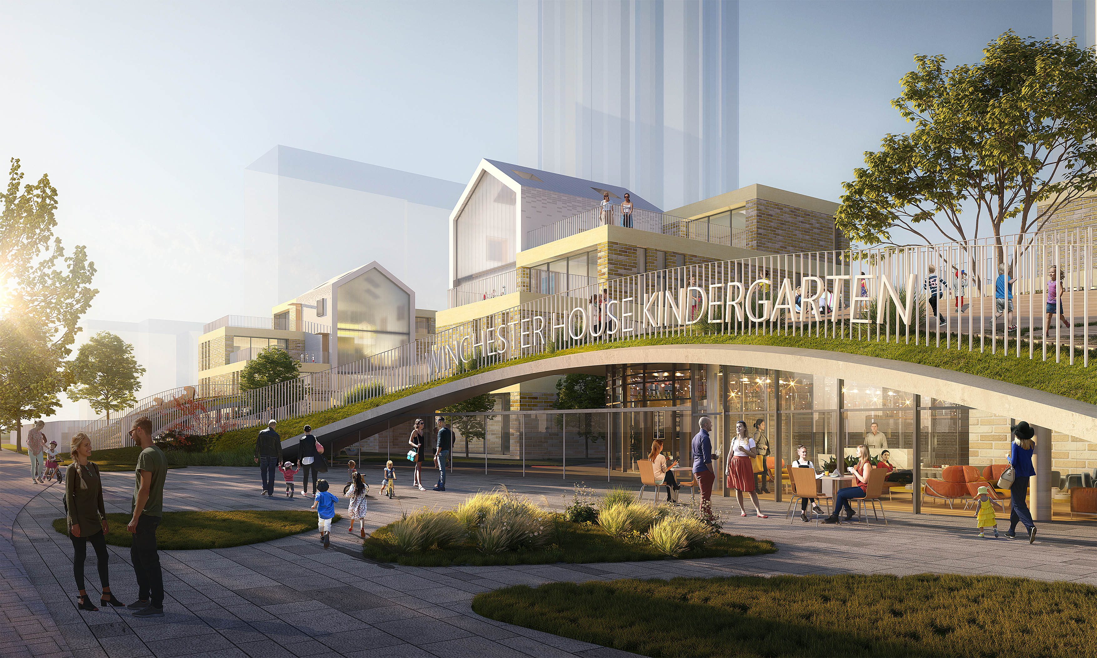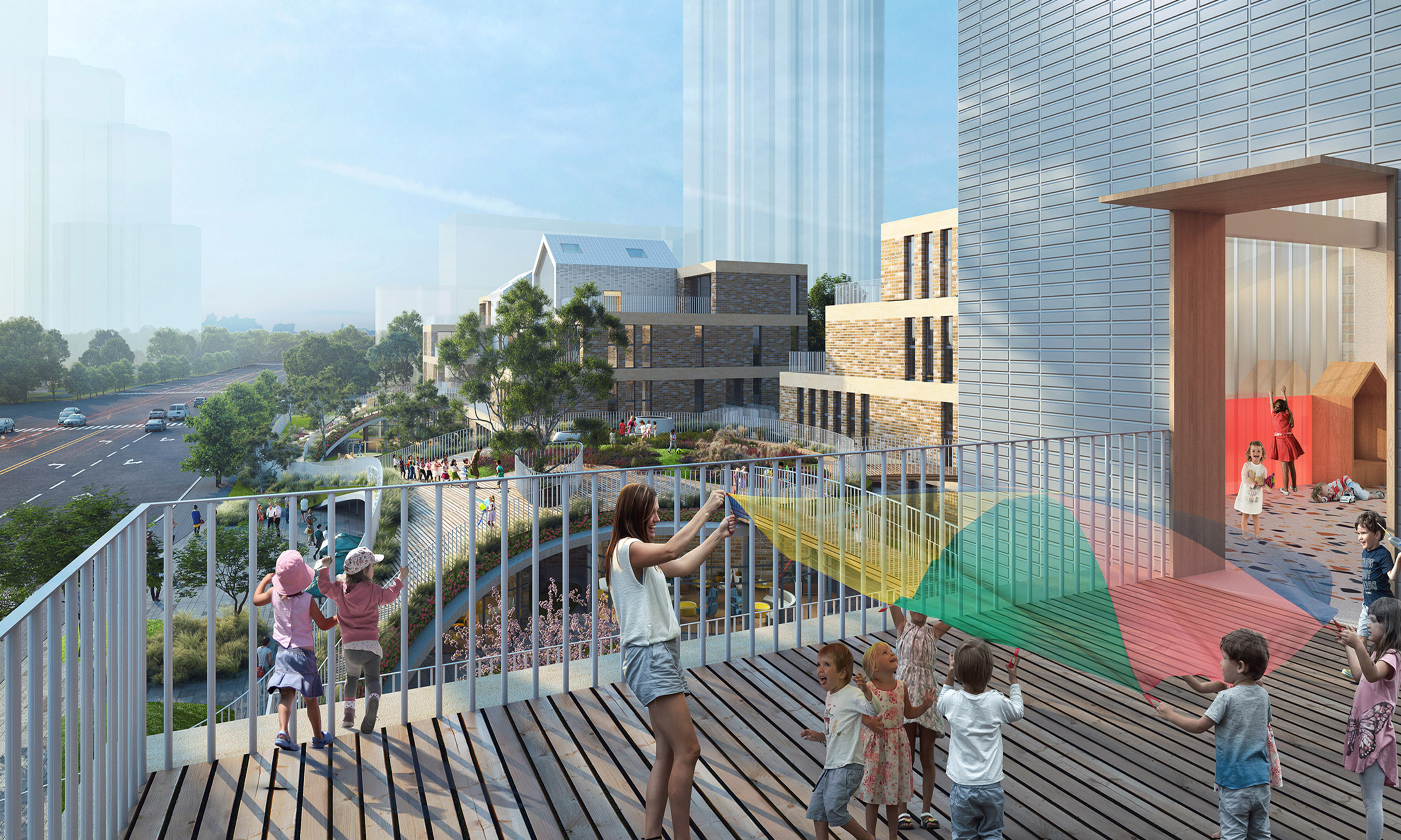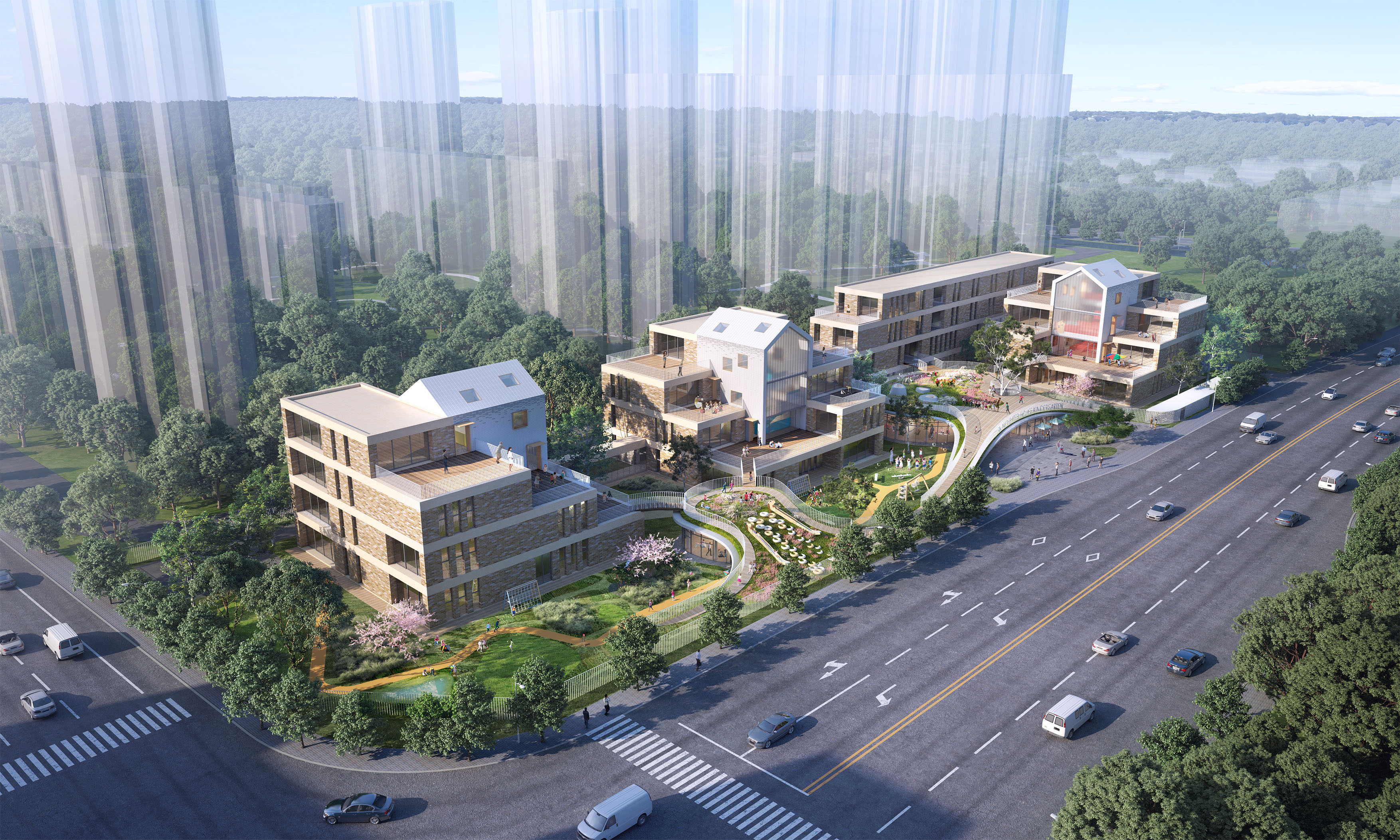 本案毗鄰醫(yī)院并被快速發(fā)展的居住區(qū)包圍,作為一家建筑面積近一萬(wàn)平方米的特大型幼兒園,如何使空間助力每一個(gè)孩子的成長(zhǎng)變成設(shè)計(jì)的難點(diǎn)。建筑師呼應(yīng)幼兒空間需求,以“花園城堡”的理念設(shè)計(jì)將項(xiàng)目分成三組模塊,每組模塊中高低錯(cuò)落的屋頂變成高層班級(jí)的戶外游樂(lè)場(chǎng),符合幼兒空間尺度需求的公共場(chǎng)地增強(qiáng)幼兒安全感和歸屬感,同時(shí)分組式布置也減輕了校方的管理難度。