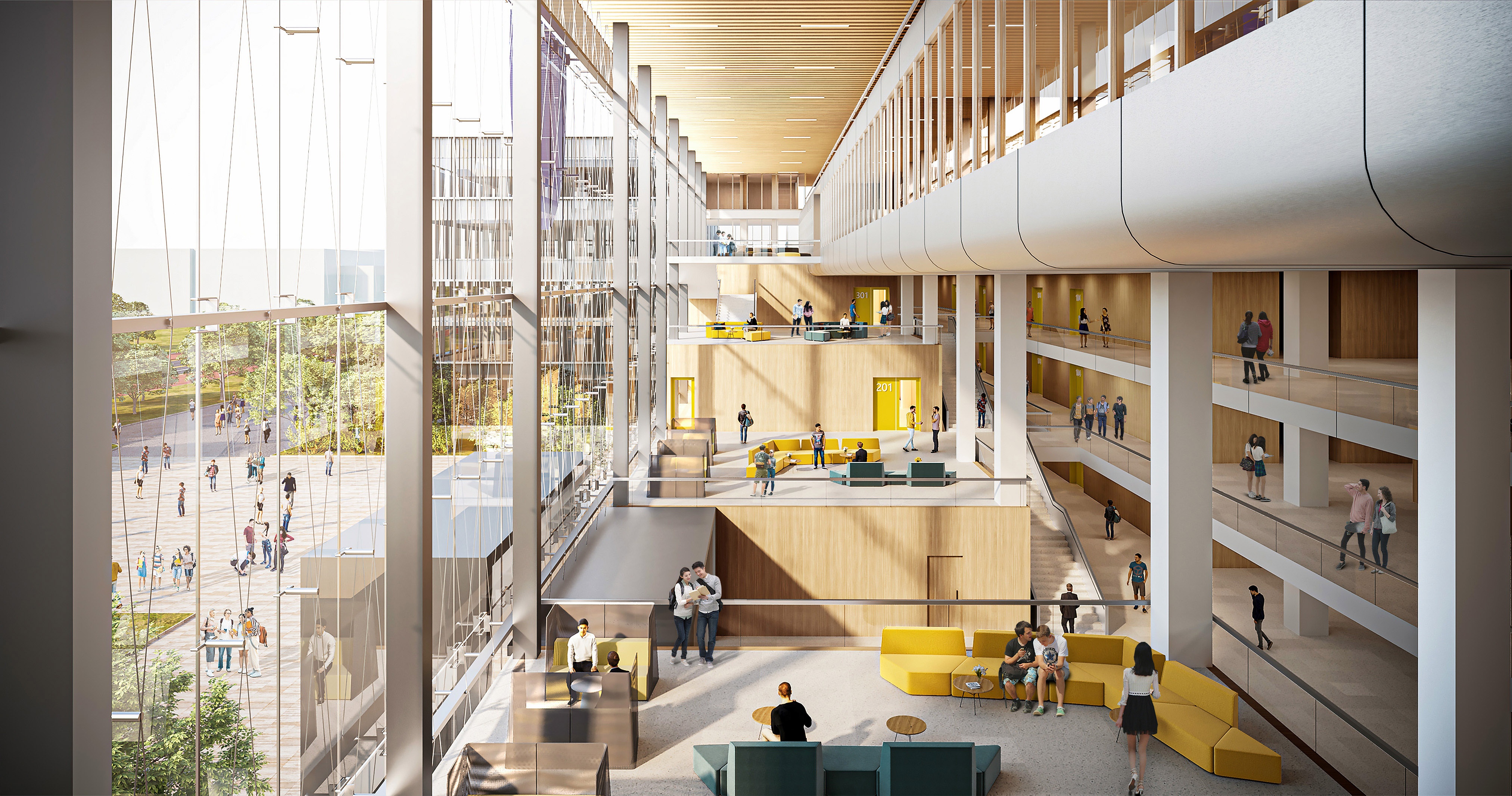西交利物浦大學(xué)基礎(chǔ)樓作為西浦校園的重要門戶,同時(shí)也是連接中心樓與藥學(xué)院的中心樞紐。歷經(jīng)17年風(fēng)雨,建筑外觀老舊、設(shè)備老化嚴(yán)重且節(jié)能效率落后。 建筑師在建筑沿街立面置入光廊,通透立面煥新校園名片;縱向結(jié)合入口高差形成陽(yáng)光中庭,激活原壓抑灰暗的入口空間;橫向外移北側(cè)教室,引入自然光消解過(guò)長(zhǎng)封閉的交通空間;以層間短梯串聯(lián)北側(cè)教室屋頂形成多層次的交流平臺(tái);靈活布置可供交流討論的“創(chuàng)意盒子”,每天被學(xué)生火爆預(yù)定。